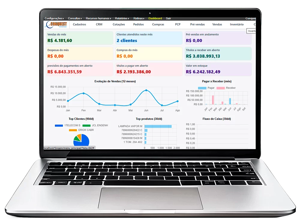 Com o sistema da Conquest, conseguimos registrar tudo em um único lugar. O controle de estoque passou a ser automático, as vendas já saem com nota fiscal e até as compras ficaram muito mais fáceis de organizar.